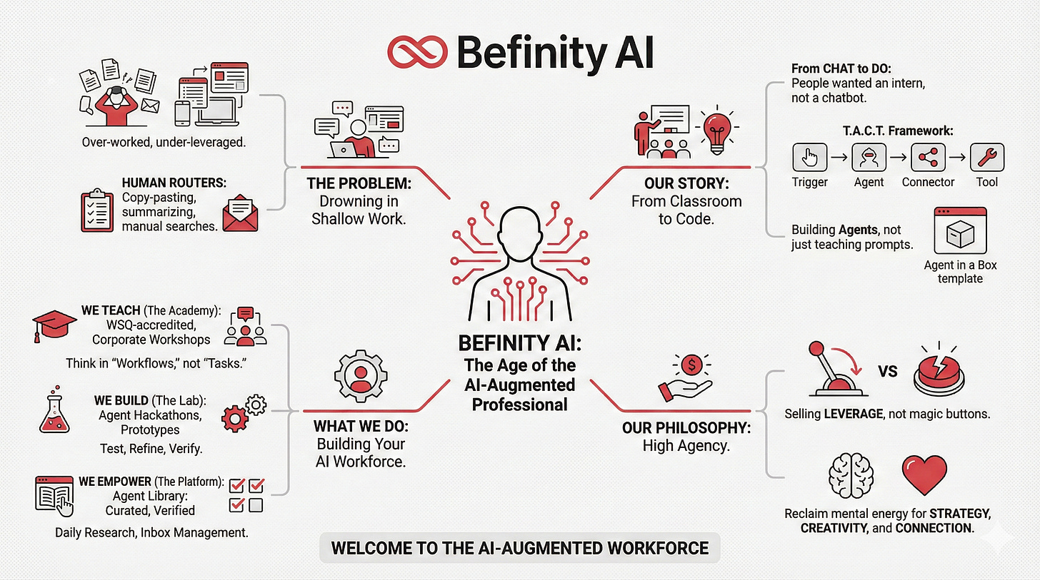 1. We Teach (The Academy) Through our WSQ-accredited courses and corporate workshops, we train teams to think in “Workflows,” not just “Tasks.” We turn employees into AI Architects.